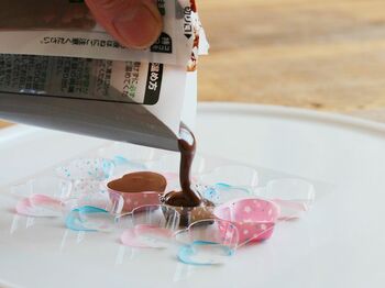 その1つが、転写モールドである。プラスチック製の動物やハートの型に溶かしたチョコを流し込み、冷やし固めると、表面にさまざまな柄が転写されるもので、専門店の商品のように見えるチョコが簡単にできる。
