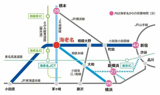 小田急線とJR相模線、相鉄線の鉄道3路線が乗り入れ、同市の玄関口となっている海老名駅は、新宿駅まで44分、横浜駅まで26分、27年にリニア中央新幹線駅の設置が予定されている橋本駅へも28分でアクセスできる。相鉄線は19年度にJR線、22年度に東急線との相互直通運転を開始する予定で、新横浜駅や渋谷駅へのアクセスも容易になる。