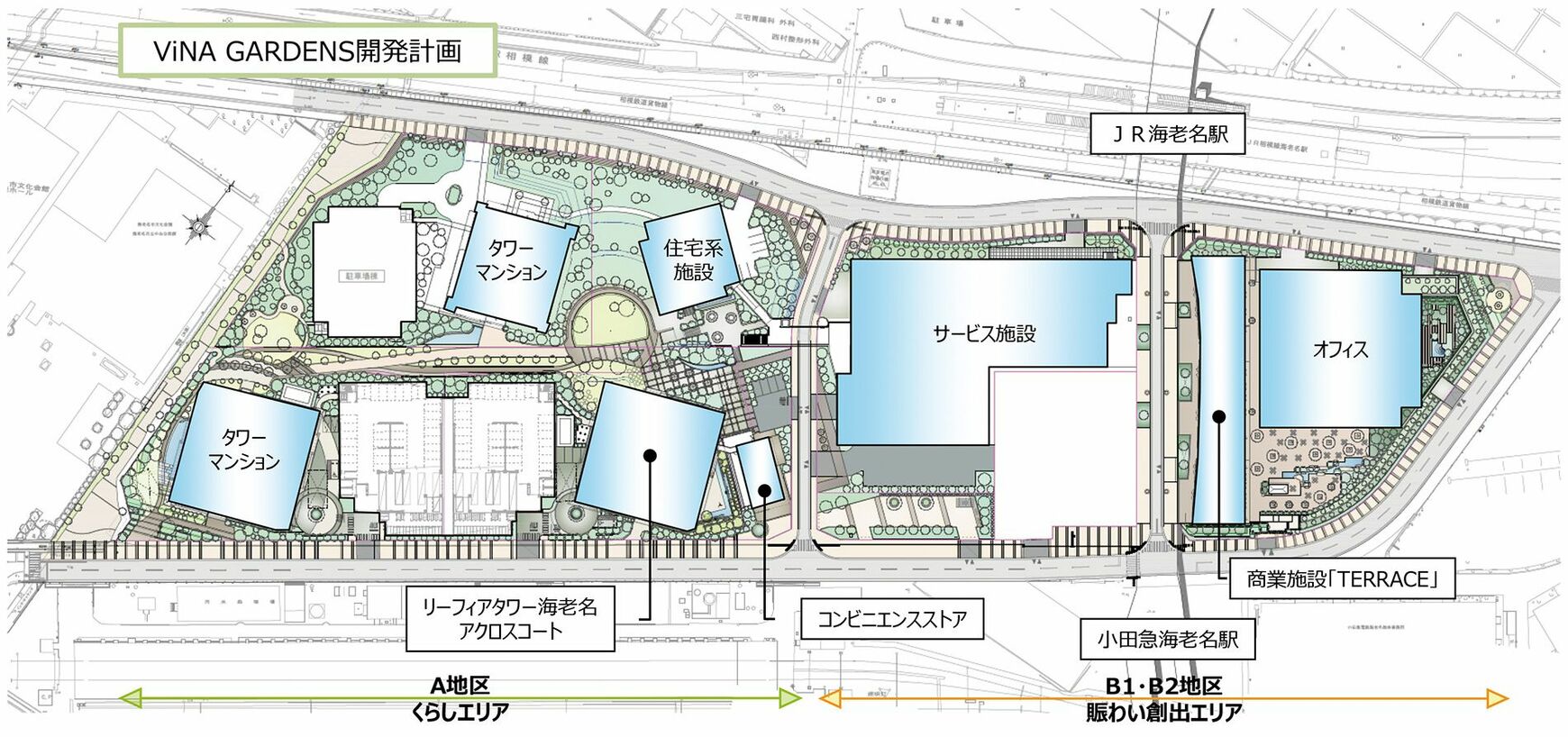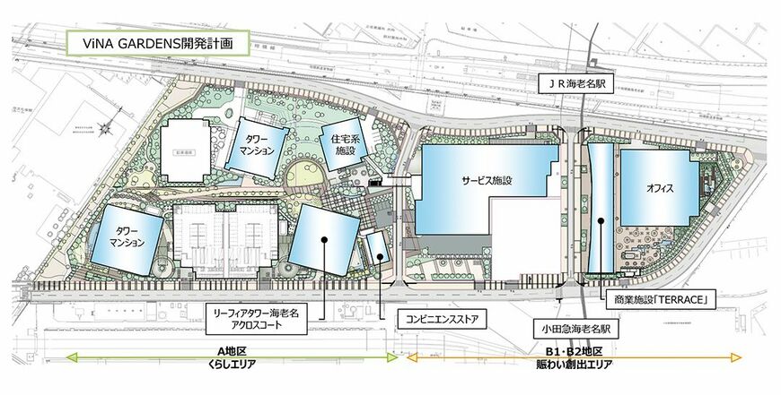 開発計画を詳しく見てみよう。敷地の中心部分を通る道路によって、東側の「賑わい創出エリア」と西側の「くらしエリア」に分けられている。さらに、「賑わい創出エリア」はJRと小田急を結ぶ自由通路によって東西に分かれ、東側にはオフィスビルと17年11月に開業した「ビナガーデンズテラス」が、西側にはサービス施設が配置されている。