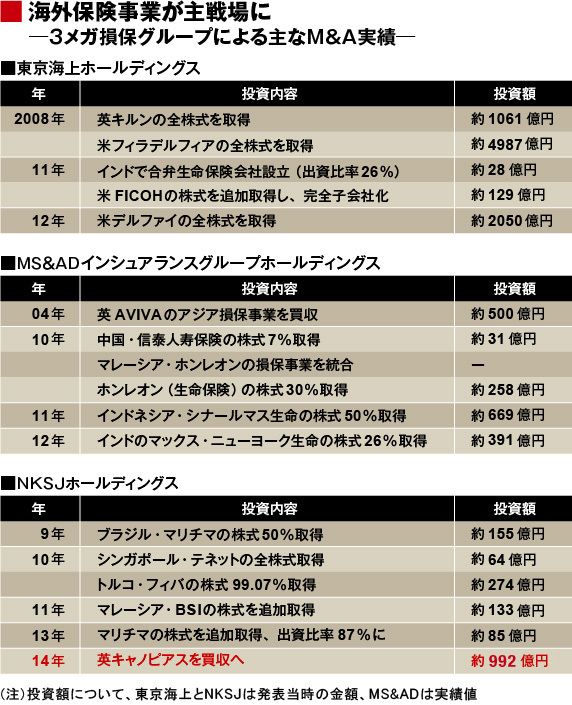 東京海上ホールディングスは、08年に約1000億円で英キルン、約5000億円で米フィラデルフィアを買収。12年にも約2000億円を投じて米デルファイを傘下に収めるなど、巨額買収を実施。東京海上が経営面での重要指標に位置付ける「修正利益」で見ると、米欧の保険事業が国内の損保事業をしのぐ規模になった。