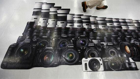 12月18日、デジタルカメラ市場の勢力図が、大きく塗り替わる可能性が出てきた。キヤノン、ニコンの大手2強とそれ以外の中堅メーカーとの体力格差が鮮明になっている。都内の家電店で7月撮影(2013年 ロイター/Issei Kato)