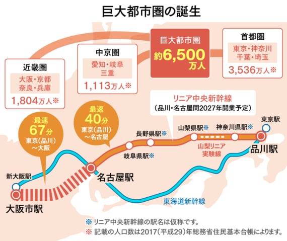 リニア開業によって何が変わるのか。注目すべきは、人口6500万人規模という世界に類例を見ない巨大都市圏の誕生だ。既存の東海道新幹線では、東京(品川)から名古屋まで移動するのに約1時間半、新大阪まで約2時間半を要する。一方、時速500キロで走るリニアが開業すれば、移動時間は名古屋まで最速40分、大阪まで最速67分へと大幅に短縮する。三大都市間をより手軽に移動できる環境が整うことで、1つの巨大な経済圏が出来上がるのだ。