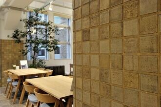 この壁面の「泰山タイル」は大正・昭和のモダン建築によく用いられたもので、今回の改修で、この部屋のためだけに復元製造された。