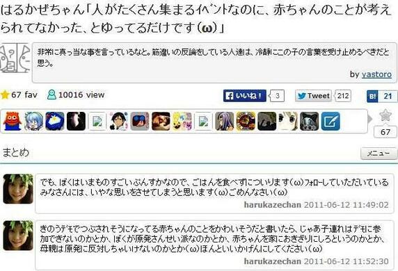 ・togetter「はるかぜちゃん『人がたくさん集まるイベントなのに、赤ちゃんのことが考えられてなかった、とゆってるだけです(ω)』」