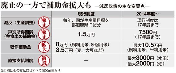 政府は今回、国が主食米の生産目標を農家ごとに割り当て、生産数量を抑制することによって価格を維持する減反政策について、5年後の廃止を決定した。併せて、民主党政権が2010年度から始めた戸別所得補償制度による補助金を14年度から半分に減らし、18年度に廃止する。