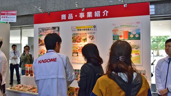 会場ロビーにずらりと並んでいたのは、カゴメの商品や事業内容を記した大型パネル。カゴメの歴史を振り返るパネルも設置されていた。それぞれのパネル前に人だかりができており、同社の社員が内容を丁寧に説明していた。