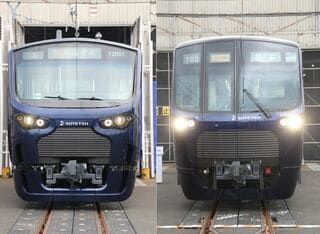 まずは見た目から。車体カラーは相鉄のブランドアッププロジェクトで採用された「YOKOHAMA NAVYBLUE(ヨコハマネイビーブルー)」で統一され、正面はどちらもグリル状のアクセントを配したデザインだが、すでにここにも違いが見られる。