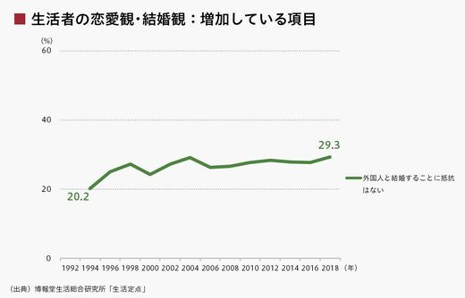 一方、1990年代から増加傾向にあるものはほとんどありません。顕著なものは外国人との結婚についてくらいでした。国内外で外国人と接する機会が増えたり、身近な知人の国際結婚を見聞きする機会が増えたりしたことなどが、緩やかなスコアの上昇に寄与しているのではと考えられます。