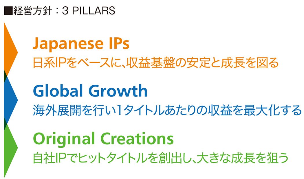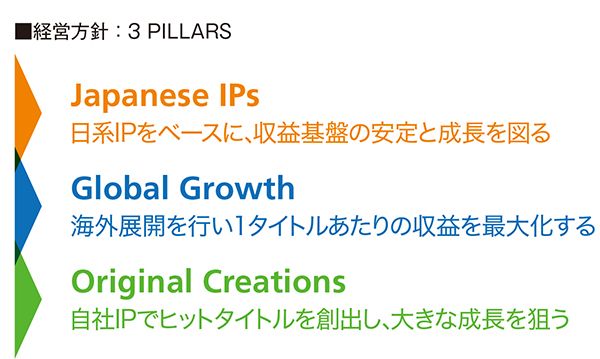森田 もちろんです。3つの柱をさらに深化させていきます。日本のIPをベースに国内外で収益基盤の安定と成長を図る「Japanese IPs」、海外展開を行い1タイトルあたりの収益を最大化する「Global Growth」、そして自社IPでヒットタイトルを創出する「Original Creations」です。19年には自社IPによるオリジナルタイトルをリリースする予定です。また音楽やアニメなどゲーム以外のメディアミックスにより、ファン拡大を狙います。