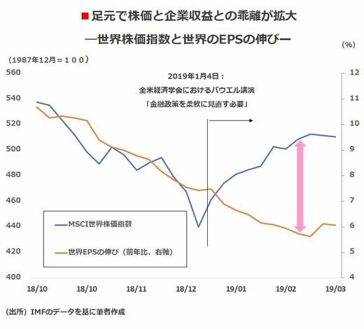 このような状況については、IMF(国際通貨基金)が4月10日に公表した「国際金融安定報告書(Global Financial Stability Report)」(以下、GSFR)でも指摘されている。具体的には「金融政策正常化に対する受け止めの変化」と「米中貿易交渉に対する楽観論」がリスク資産の騰勢を招いているとの見方が示されている。