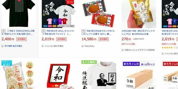 お菓子にお酒、グラス、Tシャツ……新元号「令和」のグッズが続々と登場し、楽天などのショッピングサイトで検索すると、たくさんの商品が出てくる。