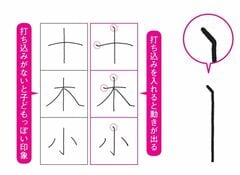 ただ真っ直ぐな線ではなく、書き始めに「ため」をつくって、斜め45度に打ち込みを入れて線を書きましょう。縦線、横線、どの線も真っ直ぐだと、メリハリがなく子どもっぽい印象になります。