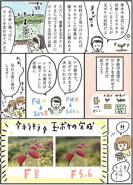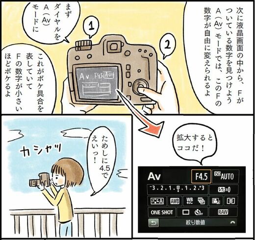 さらに、デジタル一眼カメラの醍醐味といえば「ボケ」。カメラのモードを「 A(Av)モード」にすると、Fと書かれた数字を設定することができます。これがボケ具合を変える場所で、数字が小さいほど背景がボケます。
