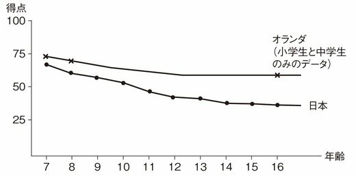 私たちはオランダの子どもと比較をしました。2007年のユニセフの子どもを対象とした幸福度調査で「孤独を感じる」と答えた子どもの割合が最少だったのがオランダだったためです。オランダの子どもでも10歳頃に自尊感情は低下する傾向はあるものの、それほど明確ではなく、思春期以降はあまり低くならないという結果でした。