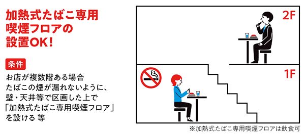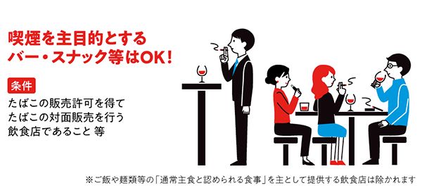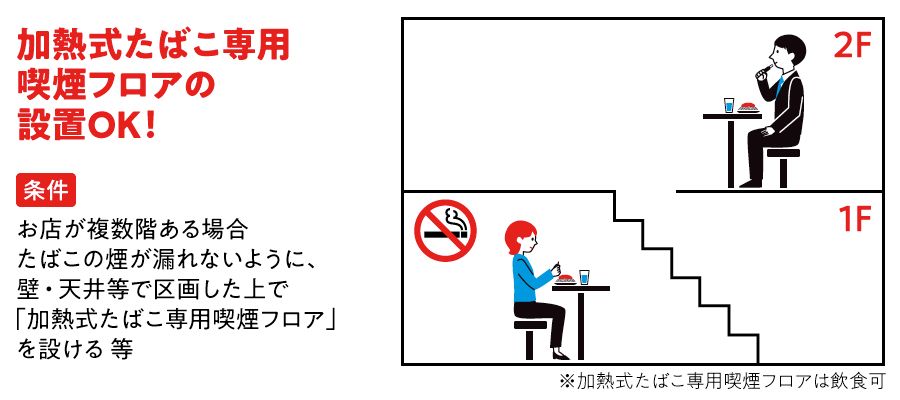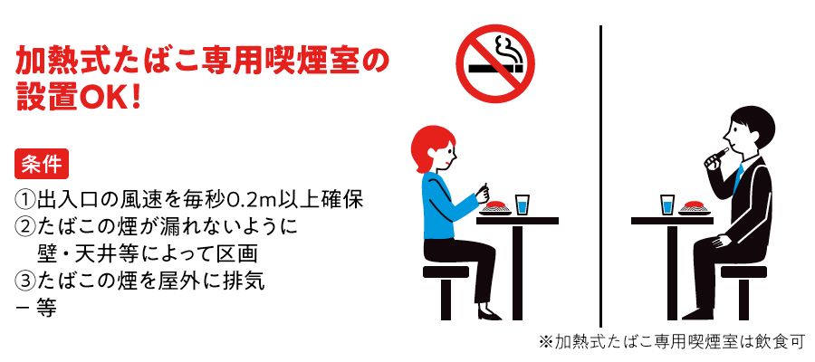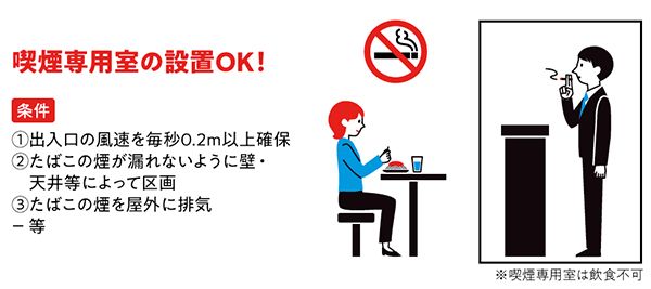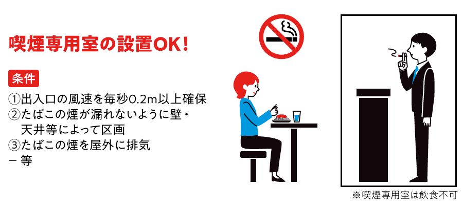 資本金5000万円超、客席面積100㎡超、2020年4月1日以降に新たに開業予定という3つのうちどれか1つにでも該当する飲食店は、原則屋内禁煙となるが、適切な措置をとることによって喫煙エリアを設けることもできる。主な措置としては、飲食不可の喫煙専用室を設置するか、加熱式たばこに限るが、飲食等可の加熱式たばこ専用喫煙室・フロアを設置することである。また、喫煙を主な目的とするバーやスナックなどは、たばこの販売許可を取得して、対面でたばこを販売する事、「通常主食と認められる食事」を主として提供していない事を条件に、喫煙目的施設(室)として現在の喫煙ルールの適用が認められる。