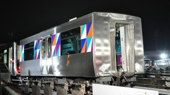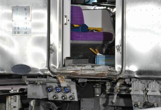 衝突した最後尾の車両は、正面の窓下にあるライト部分のガラスなども割れておらず、それほど目立った損傷はないようにも見える。だが、反対側の連結面に目を移すと、隣の車両へ渡る貫通路の部分は床板がめくれ上がっている。中間車両は連結面の一部がへこんでいる様子も見られ、衝突時の衝撃がうかがえた。