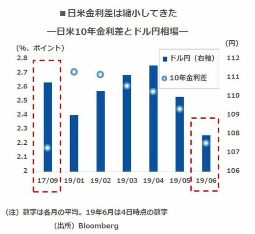 ここへきてアメリカ10年金利は2.10%を断続的に割り込んでいる。これはFF金利誘導目標が今の半分の1.25%だった頃につけていた水準であり、一気に遠い過去までさかのぼった印象がある。ちなみに2017年9月につけていたドル円相場の最安値は107.33円であり、これは年初来安値だった。この時の日米10年金利差を月平均で見てみると2.2%ポイント弱であった。現時点の10年金利差はこれに肉薄しており、金利・為替の水準だけ見れば当時と並んでいる。