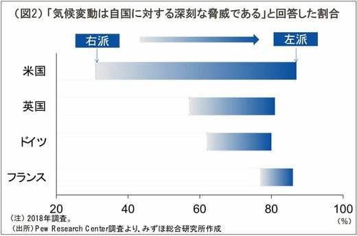 興味深いのは、アメリカとヨーロッパ主要国の双方において、環境問題が左右の政治勢力を分かつ争点になっている点だ。ピュー・リサーチセンターの調査によれば、アメリカ、イギリス、ドイツ、フランスのいずれの国においても、気候変動を自国の深刻な脅威と指摘する割合は、右派の支持者ほど低く、左派の支持者では高い傾向がある(図2)。