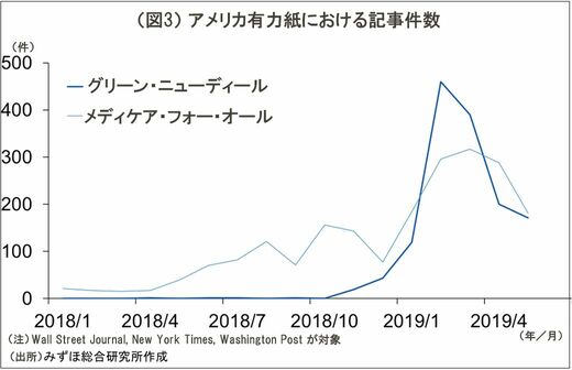 グリーン・ニューディールは、2018年11月に投開票が行われたアメリカ議会中間選挙で、史上最年少の女性下院議員となったアレクサンドリア・オカシオコルテス氏が公約に掲げ、一躍有名になった構想である。アメリカ有力紙の記事件数をみると、中間選挙直後から件数が急増している。2019年に入ると、かねて民主党支持者に関心の高かったメディケア・フォー・オール(国家主導の国民皆保険制)を上回る月があるほどだ(図3)。