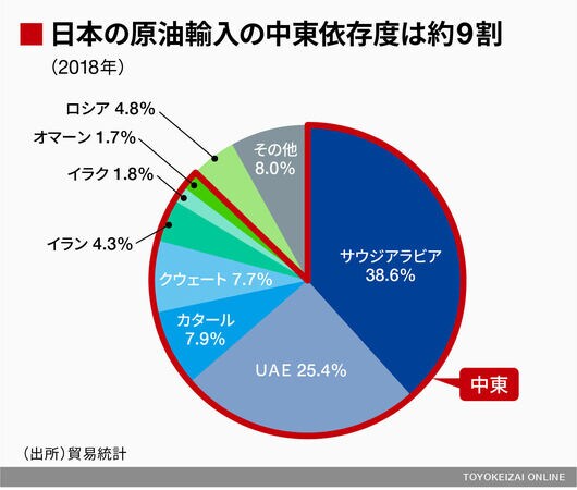 LNGと比べて、原油は中東からの輸入依存度が圧倒的に高い。わが国の原油輸入量に占める中東依存度は実に約88%(2018年)。JXTGホールディングスなど元売り各社は、自社調達に占める依存度について開示していないが、総じて同じような比率だとみられる。各社とも「情報収集している段階。国の政策に基づいて従来から備蓄を進めてきた」とする。
