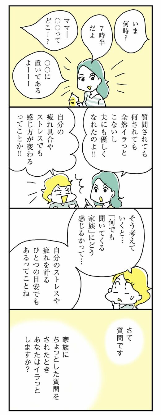 ライフ #ほしいのは「つかれない家族」 前の記事 次の記事 夫の「いま何時?」「アレどこ?」への超対処法 「ささいすぎる質問」にヘトヘトな人たちへ 3分で読める 公開日時:2019/06/21 06:00 ハラユキ イラストレーター、コミックエッセイスト フォロー 1/8 PAGES 2/8 PAGES 3/8 PAGES 4/8 PAGES 5/8 PAGES 6/8 PAGES 7/8 PAGES いらつく理由は疲労やストレス 次ページが続きます:【後日談】 8/8 PAGES