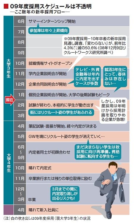 世界景気の急降下が直撃した2009年度の新卒採用戦線。10年3月に卒業予定の大学3年生にとって、ここ2年間バブル期以来の売り手(=学生側)優位に沸いた就職市場は暗転し、かつての「就職氷河期」再来の様相すら呈してきた。