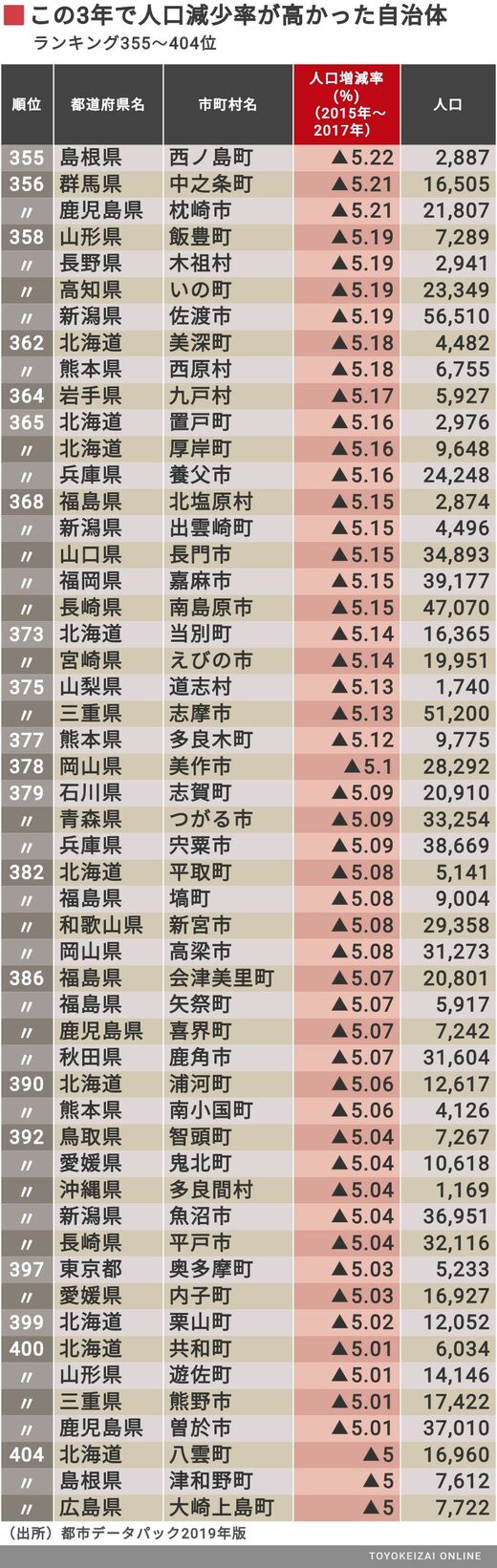 政治・経済・投資 この3年「特に人口が減った」自治体ランキング 山間部の自治体では人口減少が顕著に 3分で読める 公開日時:2019/07/05 05:00 田中 久貴 東洋経済データ事業局 フォロー 1/9 PAGES 2/9 PAGES 3/9 PAGES 4/9 PAGES 5/9 PAGES 6/9 PAGES 7/9 PAGES 8/9 PAGES 9/9 PAGES