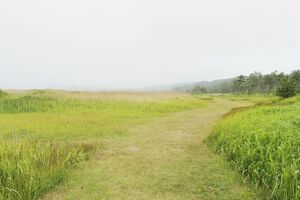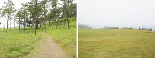 アップダウンの激しい遊歩道を最後に、種差海岸の天然芝生地にたどりついた。足元はアスファルト、砂利、砂、土と変化し、野趣に富んだ景色が展開した。
