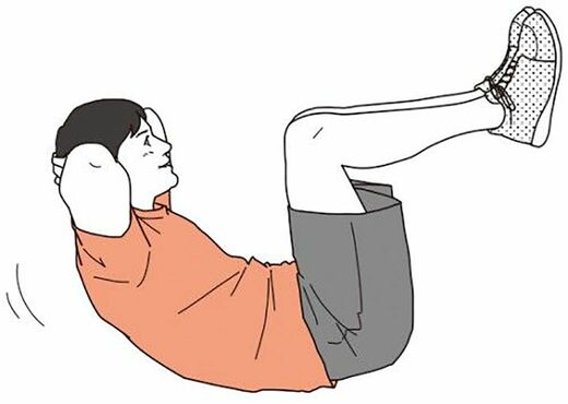 【2】手を頭の後ろで組み、上半身を2秒間かけて起こす。