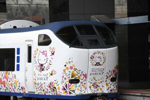 新幹線に続き、今年1月29日からは関西国際空港と新大阪・京都などを結ぶ「はるか」に「ハローキティはるか」がデビューした。当初は1編成のみだったが、その後本数を増やし、現在ははるかの約半分がキティはるかとなった。関空に降り立った訪日外国人観光客の中には日本に来てからこの列車の存在を知る人も多く、「見たい、乗りたい」という声が続出。こうした声に応えた形となった。
