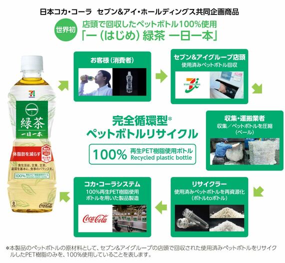 実はコカ・コーラシステムは19年6月に、こうした目標に先鞭をつける画期的な取り組みを日本国内で始めている。店頭で回収したペットボトルを100%使用した「一(はじめ)緑茶 一日一本」という商品のリニューアル発売だ。これはセブン&アイ・ホールディングスとの共同企画である同商品の使用済みペットボトルをセブン&アイグループの店頭で回収し、それをリサイクルし再び製品化するというもの。ペットボトルを世界で初めて※7「完全循環」させるという未来的なプロジェクトだ。