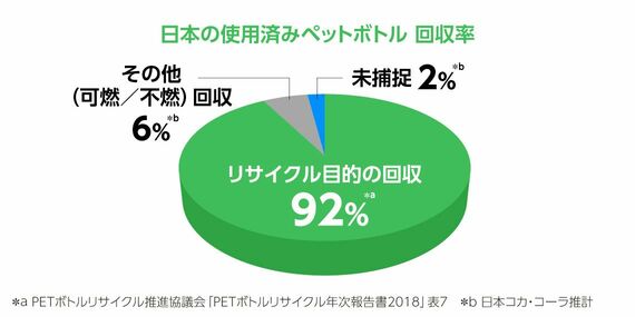 ※5 使用済みペットボトルを回収・リサイクル処理したうえで、ペットボトルとして再生し、飲料の容器として用いること。2018年は約17%