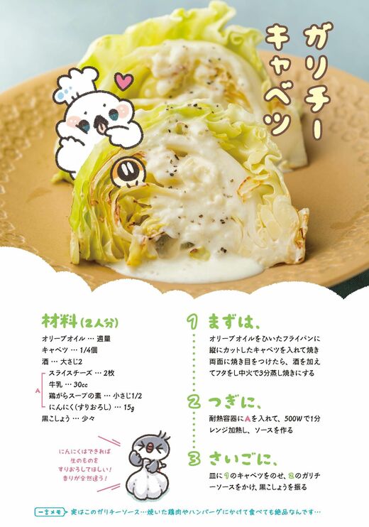 1品目は、ガリチーキャベツ。キャベツ4分の1個を縦半分に切って、油をひいたフライパンで両面蒸し焼きにして、ガリチーソースをかけるだけ……これ、最高においしいんです。