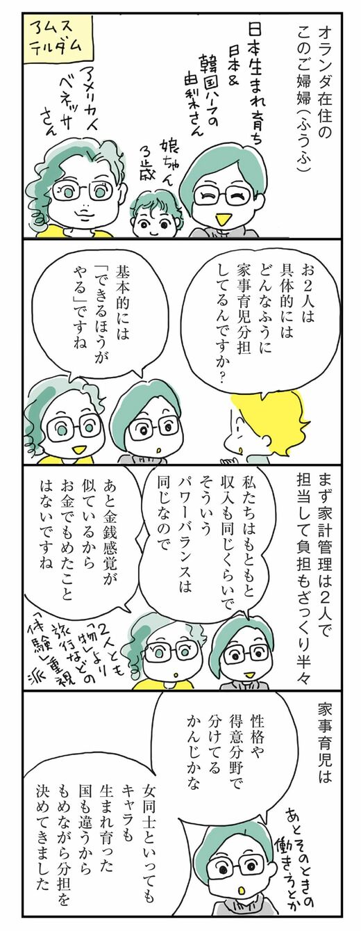 数回に分けて、オランダ・アムステルダムに住むある家族の家事育児分担を紹介していますが、前々回はレズビアンカップルである2人が婦婦(ふうふ)になって妊娠するまでの経緯(記事はこちら)、前回はオランダ出産事情(記事はこちら)、そして今回は、2人の家事育児分担の詳細を紹介します。