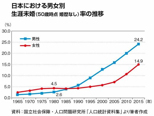 いま日本では「未婚化」がものすごいスピードで進んでいます。50歳の時点で一度も結婚経験がない人の割合を示す「生涯未婚率」の数字が激増しているのです。