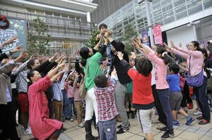 「住民創発プロジェクト」の1つ、オリジナルパフォーマンス(フラッシュモブ)「たまプラ一座だよ! 全員集合!」の様子。老若男女150人が演じた(写真:東急電鉄)