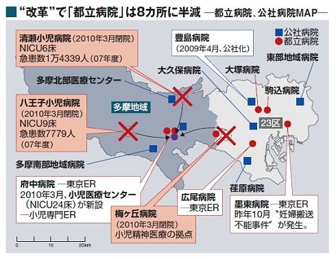 石原慎太郎知事が就任した10年前、東京都は未曾有の財政危機に瀕していた。就任から2年後の01年、都立病院“改革”の青写真が示された。「都立病院は、高水準の3次(重症)医療に特化する。残る病院は統廃合もしくは公社に移管する」というものだ。医療をめぐる状況が変わり、病院機能の拡充が求められている現在も、改革プランは見直されることなく、実行されつつある。
