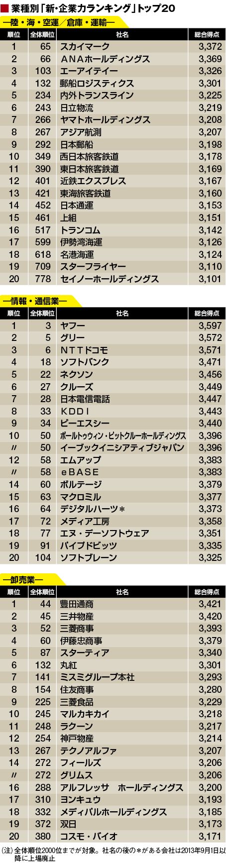 規模的に大きいメガキャリア、3位NTTドコモ(6位)、4位ソフトバンク(18位)、7位日本電信電話(28位)、8位KDDI(33位)も並ぶが、それ以外は超大企業はなく、成長性を武器に高得点をマークした企業が多い。