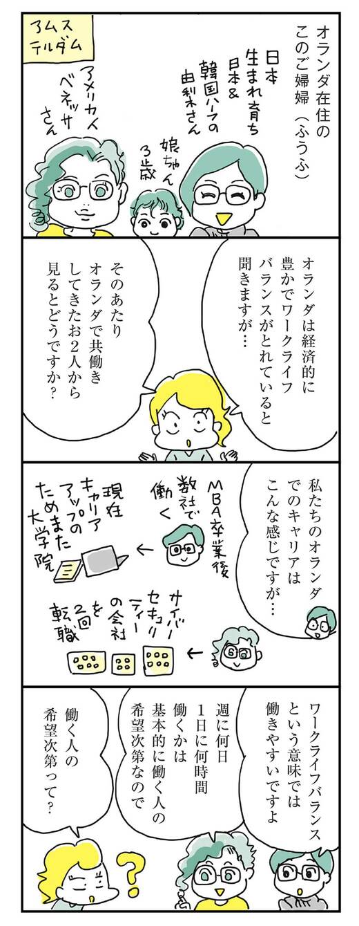 数回に分けて、オランダ・アムステルダムに住むレズビアンカップルの家事育児分担を紹介してきました。第1回はレズビアンカップルであるふたりが婦婦(ふうふ)になって妊娠するまでの経緯(記事はこちら)、第2回はオランダ出産事情(記事はこちら)、第3回は2人の家事育児分担の詳細(記事はこちら)、そして今回はワークライフバランス先進国と呼ばれるオランダの働き方を紹介します。そこから見えてきたのは、日本で長時間労働が減らない理由でした。