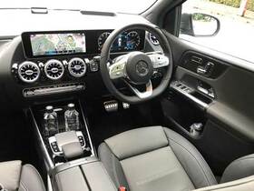 前席は、大きな液晶パネルを使ったMBUX(メルセデス・ベンツ・ユーザーエクスペリエンス)のインフォテイメントシステムをはじめ、新しい機能が斬新な雰囲気をもたらしている。