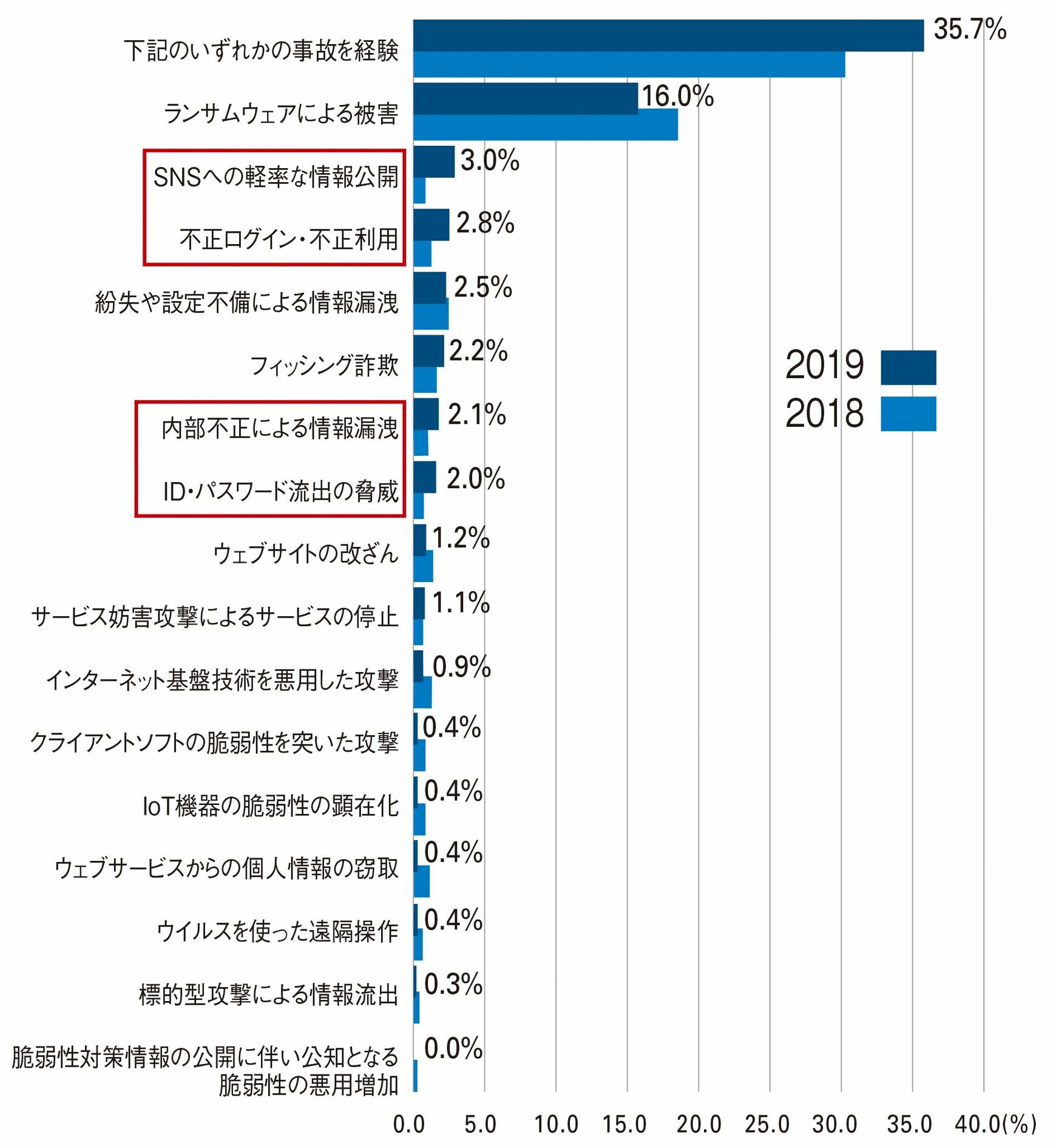 同社によると、19年の調査では、セキュリティー事故は前年から約5ポイント上昇。両年ともランサムウェアの被害がトップだったが、19年はSNSへの軽率な情報公開や不正ログイン、不正利用のほか、内部不正による情報漏洩など、社内の人的な問題やオペレーションのミスから発生する事故が増えている。こうした事故は、必ずしも情報システム(以下、情シス)部門の担当者が対策を怠った結果ではないという。