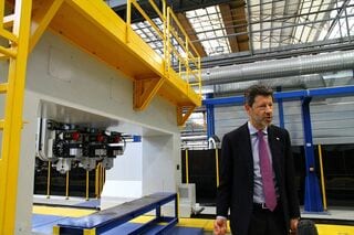 テスト建屋を出て隣へ移動すると、そこが同工場の中枢となる組み立て現場だった。入ってすぐの場所には、整形される前のアルミ板が並び、車体の状態へ組み立てられるのを待っていた。奥にはアルミ板を切り出す機械があり、切り出されたものを順に溶接して組み立てていく、という工程だ。