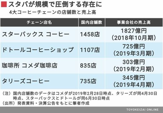 運営会社であるスターバックス コーヒー ジャパン(日本法人)の業績も他を圧倒する。売上高は1800億円を超え、ドトールコーヒーの約2.5倍だ。躍進が目立つ3位コメダと4位タリーズだが、スタバとは売上高で5~6倍もの差がある。