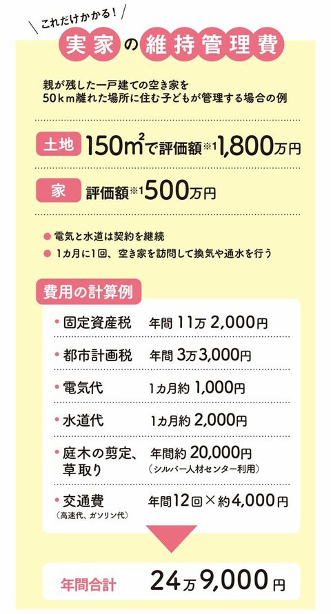 実家を相続しても、住まずに所有しているだけでは、下の図のように、税金や維持費だけがかかり続けます。人が住んでいないと家は傷みます。月に1度は換気をしたり、水道の水を流したりする必要があるため、次第に管理するのが負担になってくることが多いです。