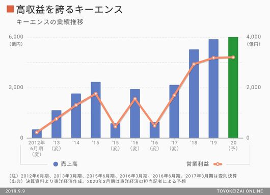 キーエンスはFA(ファクトリーオートメーション)に関わるセンサーや画像処理システムを手がける企業だ。FAとは工場の生産工程を自動化するために導入するシステムのことだ。2019年4~6月期の純利益こそ9年ぶりの減益となったが、工場の自動化需要が旺盛なこともあり、同社の業績は堅調に推移している。