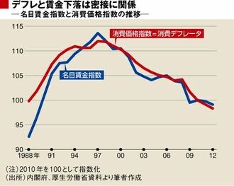 逆に言えば、インフレが起きているときは、同時に経済成長が高く、名目賃金も上昇している。そしてこのときは、実質賃金も上昇している。今後、脱デフレに伴い日本経済が復活し、賃金は、名目ベースでも実質ベースでも増え始めるだろう。そのプロセスが、アベノミクスでようやく始まったのである。