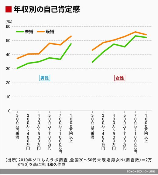 拙著『ソロエコノミーの襲来』の中でも、未婚男性の自己肯定感を高めている要因とは何かについてのデータを掲載しています。結果だけ簡単にお伝えすると、未既婚関係なく男性の場合は、恋愛が充実していればいるほど自己肯定感が高くなるという結果でした。意外なのは、そうした恋愛因子は女性の自己肯定感にはあまり関係なく、男性だけが影響を受けるという点です。