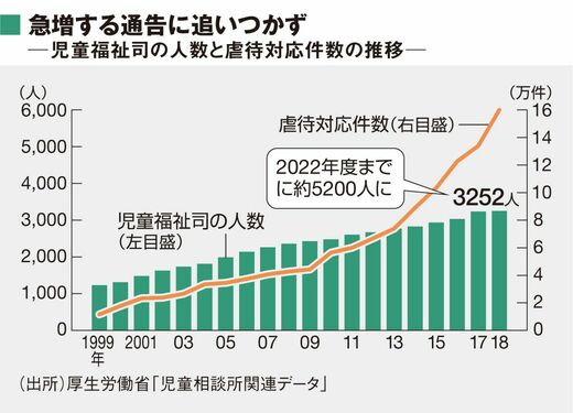 では児童福祉司の増員により、現場の労働環境は改善されつつあるのか。時間外労働時間の最大値が月80時間を超えた徳島県の児相担当者は、「相談件数が増え続け、2018年にピークを迎えた。人数が増えても時間外労働時間も増えている」と話す。