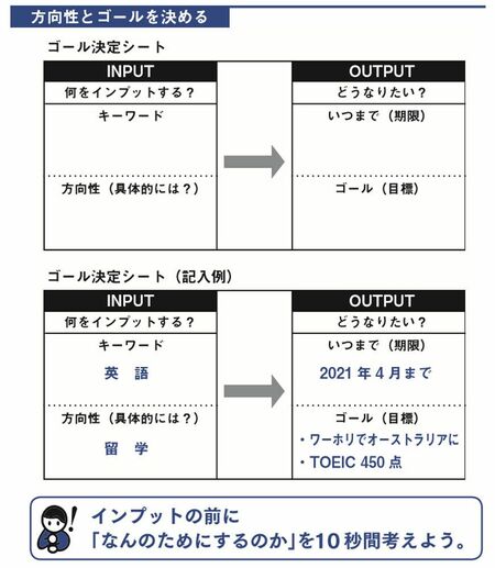 「TOEIC450点」であれば、なんとかなりそうです。それは、いつまで?「2021年4月まで」。期限まで決めなくてはいけません。ここまで具体的に方向性が決まれば、「どんなテキストを買ってきて」「週に何時間勉強が必要なのか」、具体的な勉強法が見えてきます。「インプット」と「目標設定」は、必ずペアで行うようにしましょう。