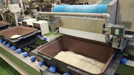 炊飯工程のエリアに足を踏み入れると、箱の中にコメが自動で投入され、長いベルトコンベヤーに乗って流れていく光景が目に入った。その後、洗米→水分吸収→炊飯までの作業がベルトコンベヤーの上で完結する。